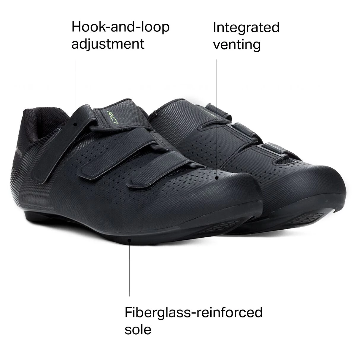 Shimano’s entry-level RC1 Cycling Shoe hits the sweet spot between spin-class readiness and budget-minded touring. With an eye on simplicity and comfort, the three offset hook-and-loop straps close down to provide a secure and performance-focused fit while keeping a refined and aerodynamic profile. The moderate stiffness of the fiberglass reinforced nylon sole, combined with opening the straps after your interval session, provides a pleasant walking experience compared to highly stiff carbon-soled shoes on the market. The perforated synthetic upper breathes and cleans easily after early spring rides on semi-damp roadways. The RC1 is equipped to pair with 3-bolt cleat systems making it ideal for road-specific cycling or your at-home trainer.