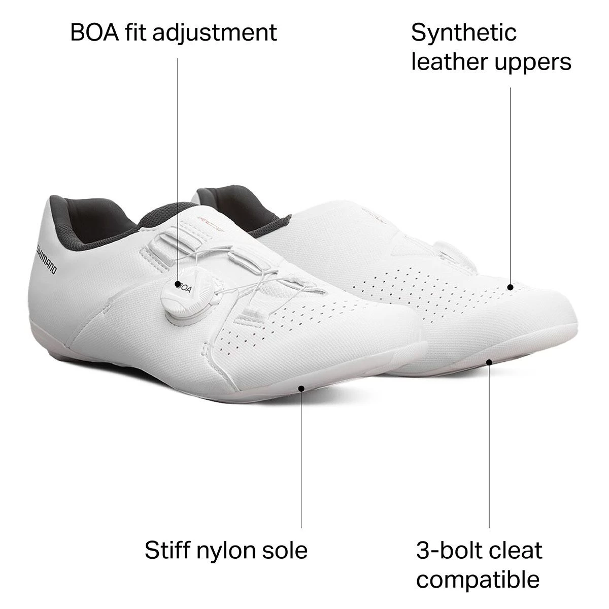 For comfort mile after mile, Shimano integrates the midsole to the upper for a seamless fit and unified form that stabilizes your foot during high power efforts. The RC300 is compatible with 3-bolt cleats for the traditional road pedal platform.